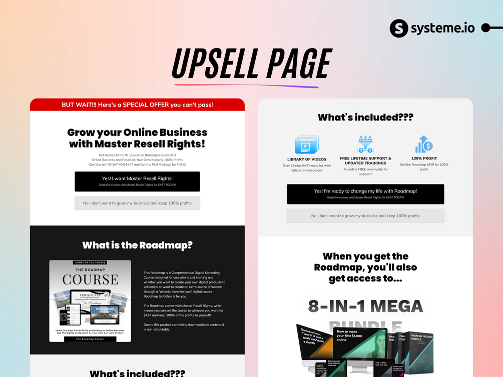 NOTE: You will receive a downsell funnel for the Systeme 8-in-1 PLR course, not the course itself.