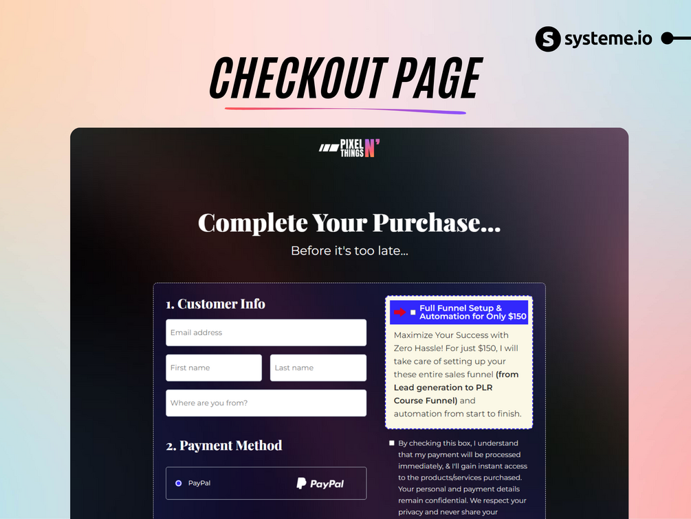 This offer is exclusively for Systeme.io users. No account yet? No problem! Create a free one here ( https://pixelnthings.com/get/systeme ). It’s totally free, and you can build up to 3 funnels.